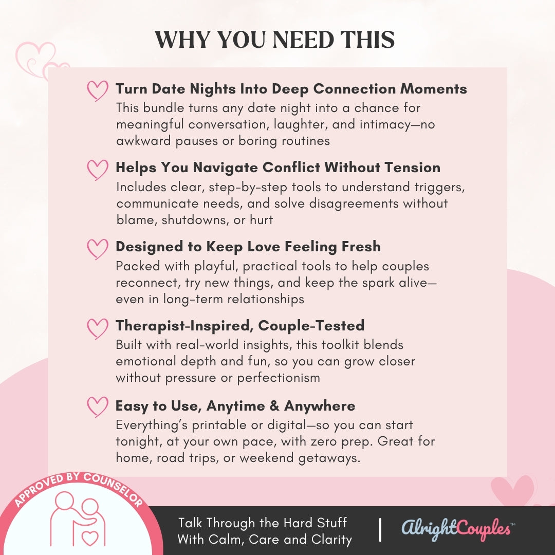 Ditch distractions and boring routines—this bundle makes every date night feel intentional, playful, and emotionally rich. From reflective conversations to creative activities and conflict resolution, you'll discover how to truly bond with your partner again. Designed with emotional intimacy and fun in mind, these expert-crafted tools keep your connection alive and growing.