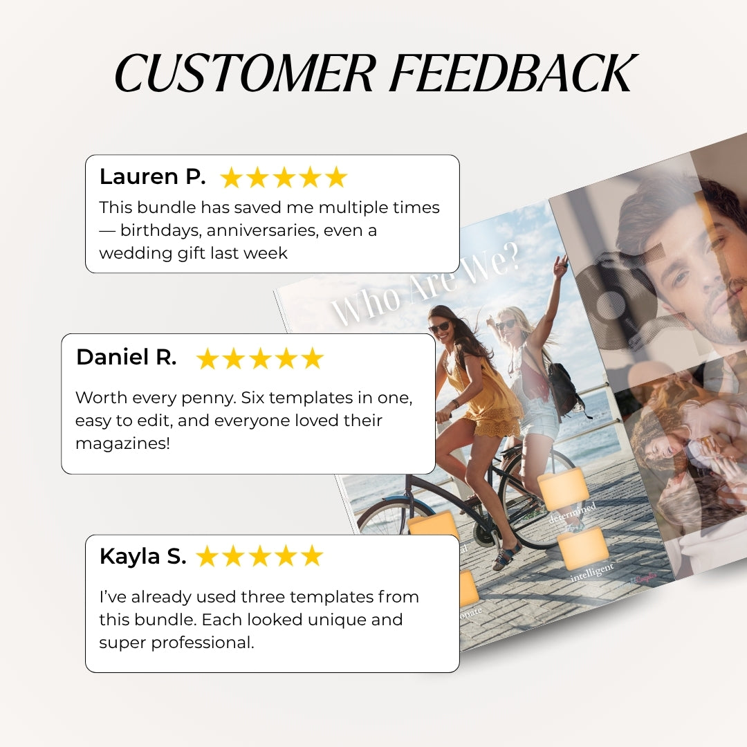 Transform your memories into glossy, custom magazines that look straight off the newsstand! This Trending Editable Magazine Bundle includes six professionally designed templates for every milestoneโbirthdays, weddings, friendships, travels, and more. Perfect for gifts, planners, or anyone who wants to create a stunning keepsake that tells their story beautifully.